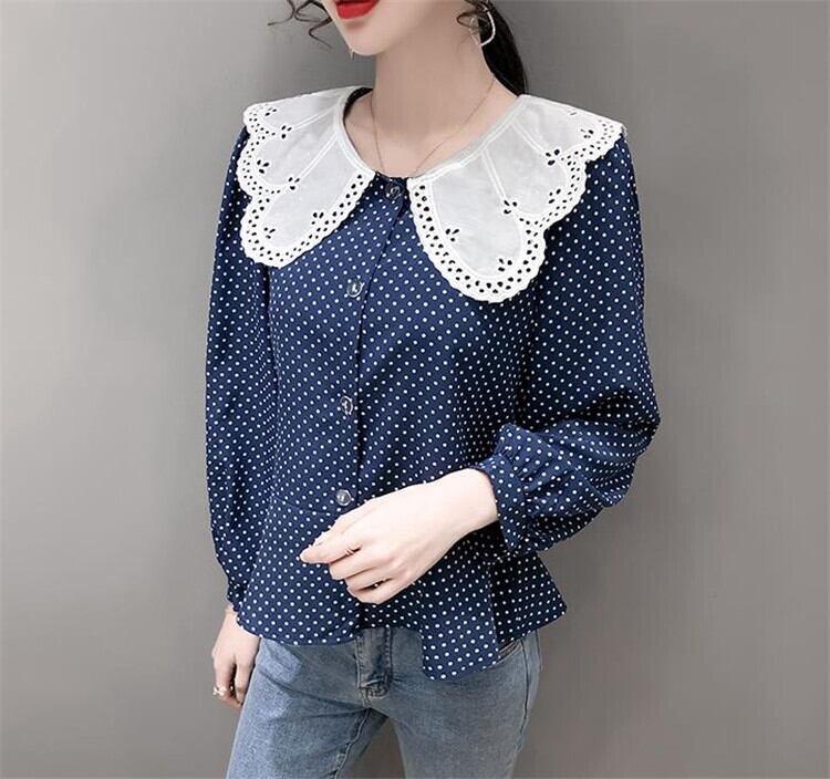 ドット シャツ デザインセンス ギャザリング 人形の襟 長袖 トップス