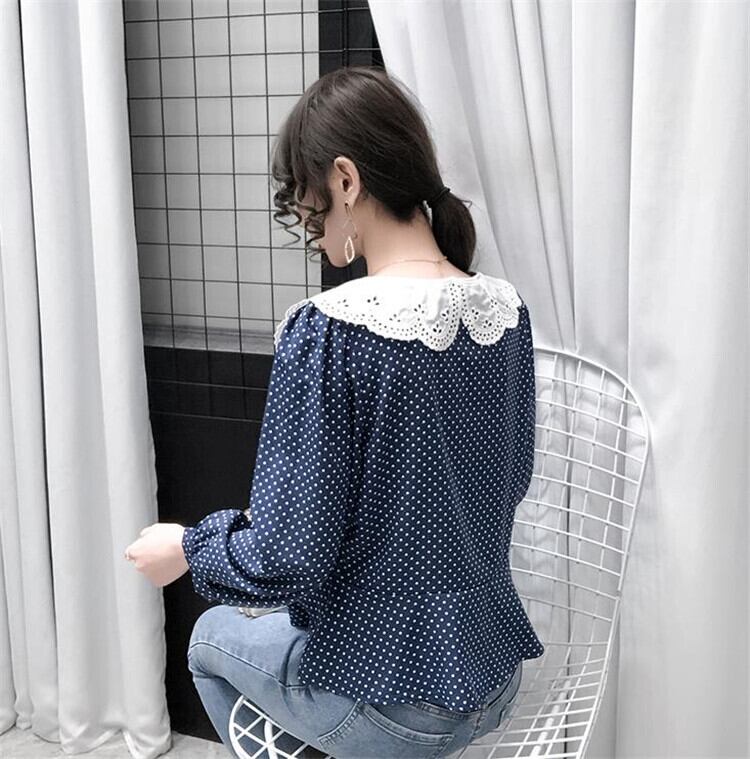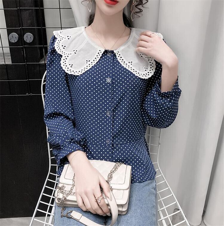 可愛いバックデザイン ドット シャツ デザインセンス ギャザリング 人形の襟 長袖 トップス
