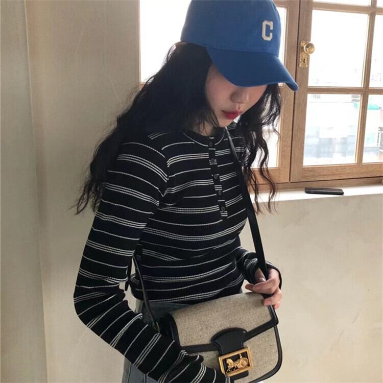 春モデル チェスト ボタン シンプル ストライプ スレッド 長袖 百掛け Tシャツ 快適