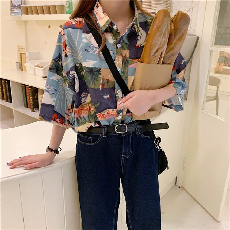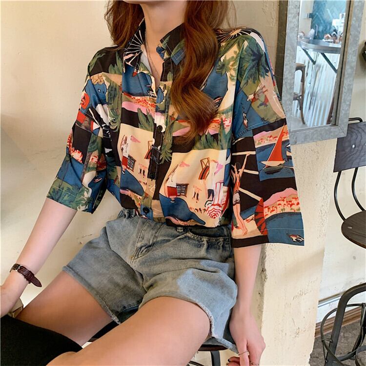 レトロ カジュアル ビーチ サンシャツ 百掛け トップス ゆったり 半袖 シャツ