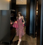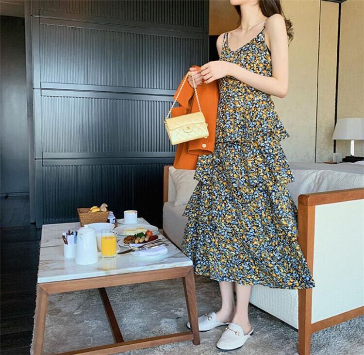 2色花柄 キャミワンピ トレンド シフォン ケーキスカート sweet系 エレガント 細身