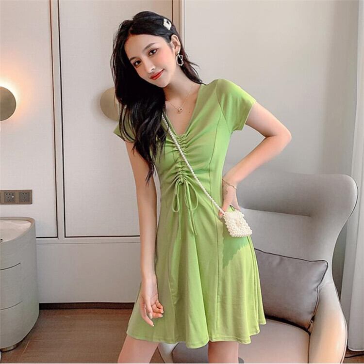 スリム Vネック 半袖 ハイウエスト ワンピース 気質 百掛け レトロ カジュアル