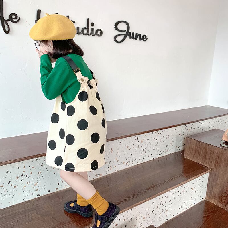 キッズ レトロ Tシャツ+ワンピ ドット柄ワンピース サロペットスカート 韓国風子供服 7-15