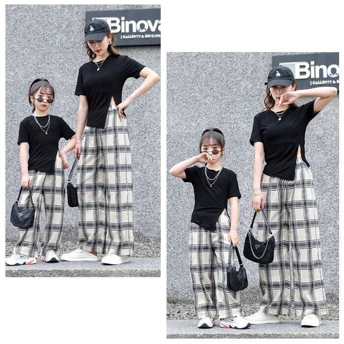 親子ペア 夏服 ママと娘 セットアップ レジャー 上下セット 親子 Tシャツ+ワイドレッグパンツ 2点セット 半袖 長ズボン チェック柄パンツ 女の子 レディース